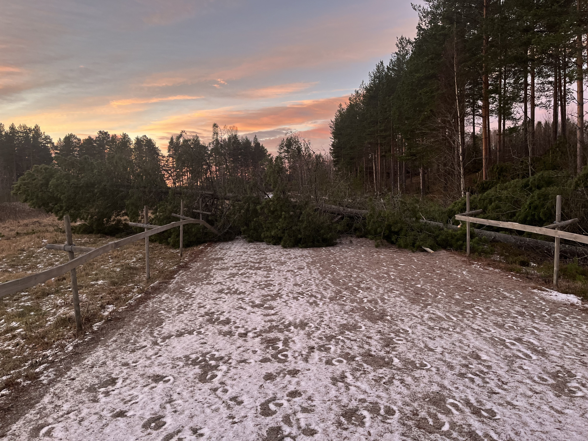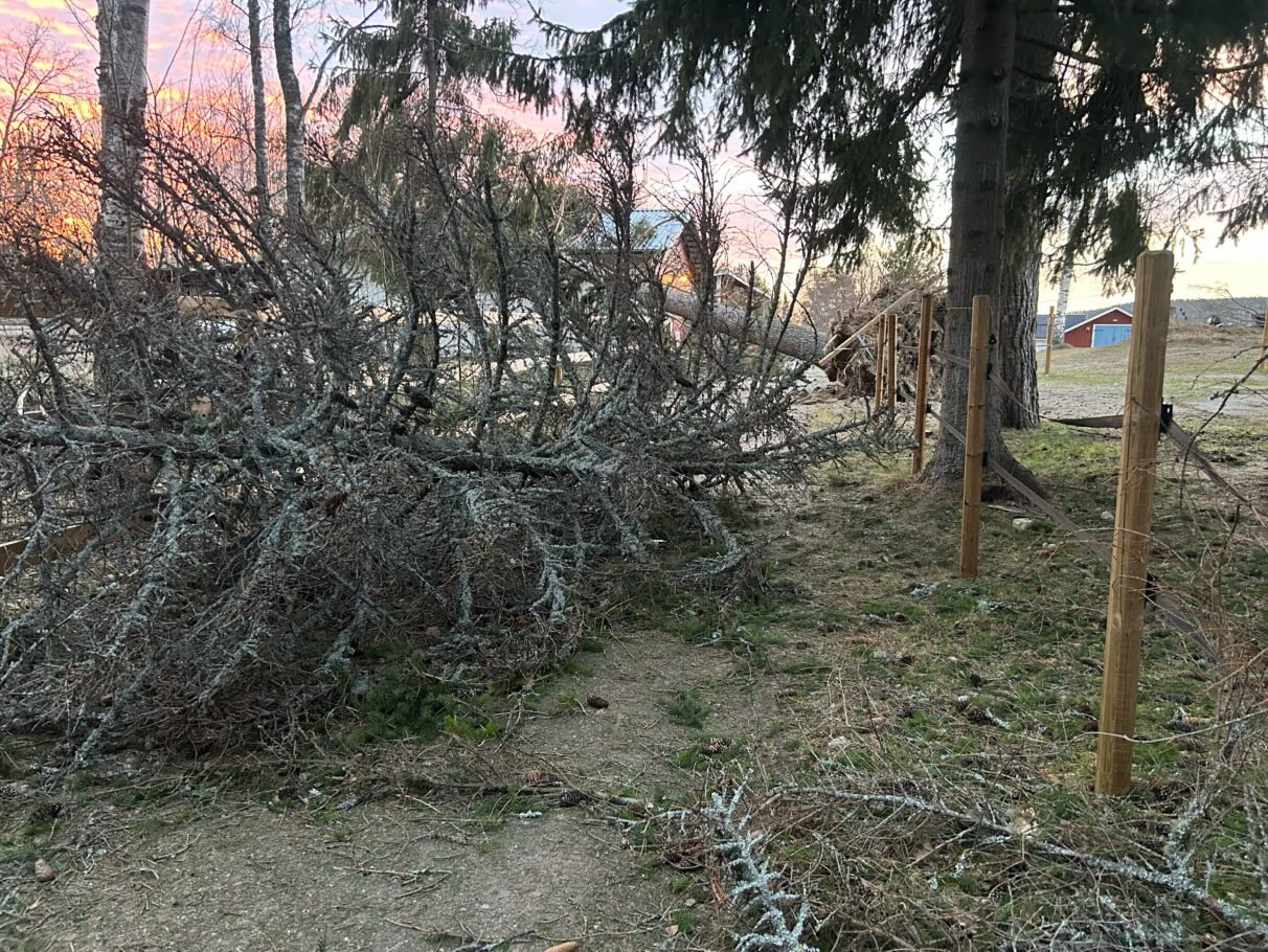 – Tre träd har fallit över ridbanan, staketet är trasigt på flera ställen och vägen dit är blockerad av en grantopp. Även ridvägen upp mot berget ligger under flera stora träd. Det är mycket som återstår att ta hand om.