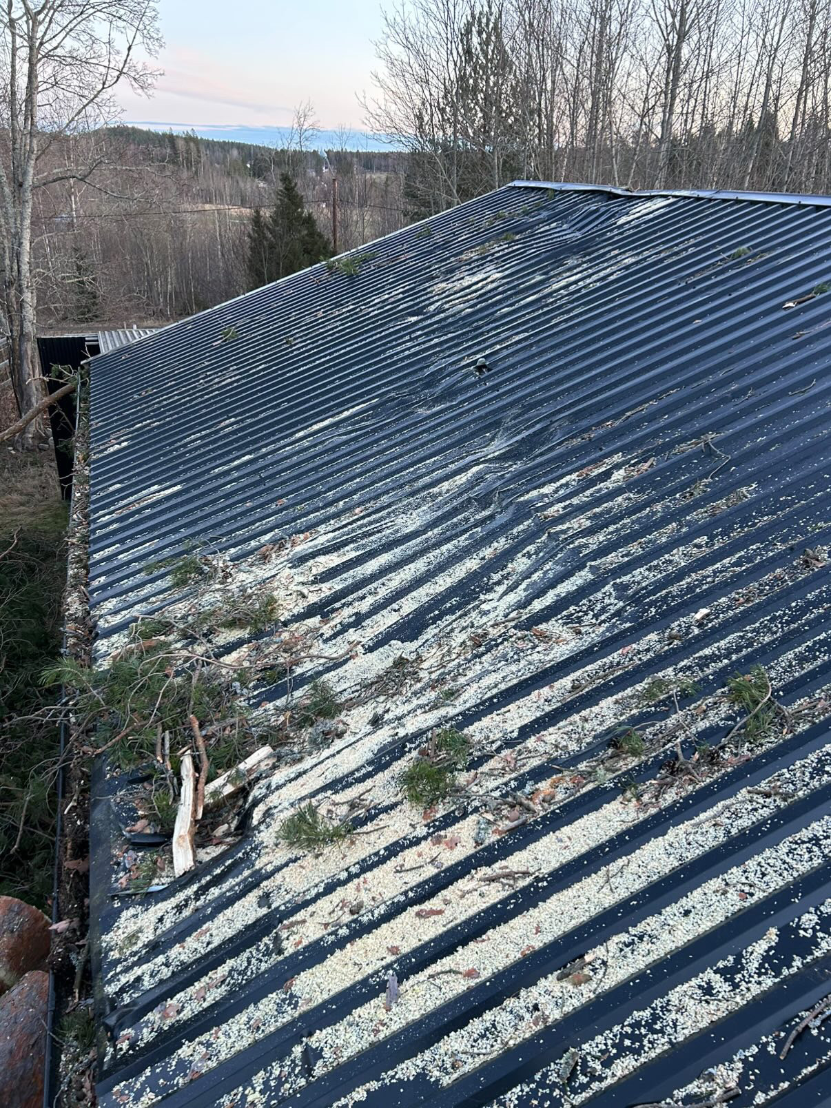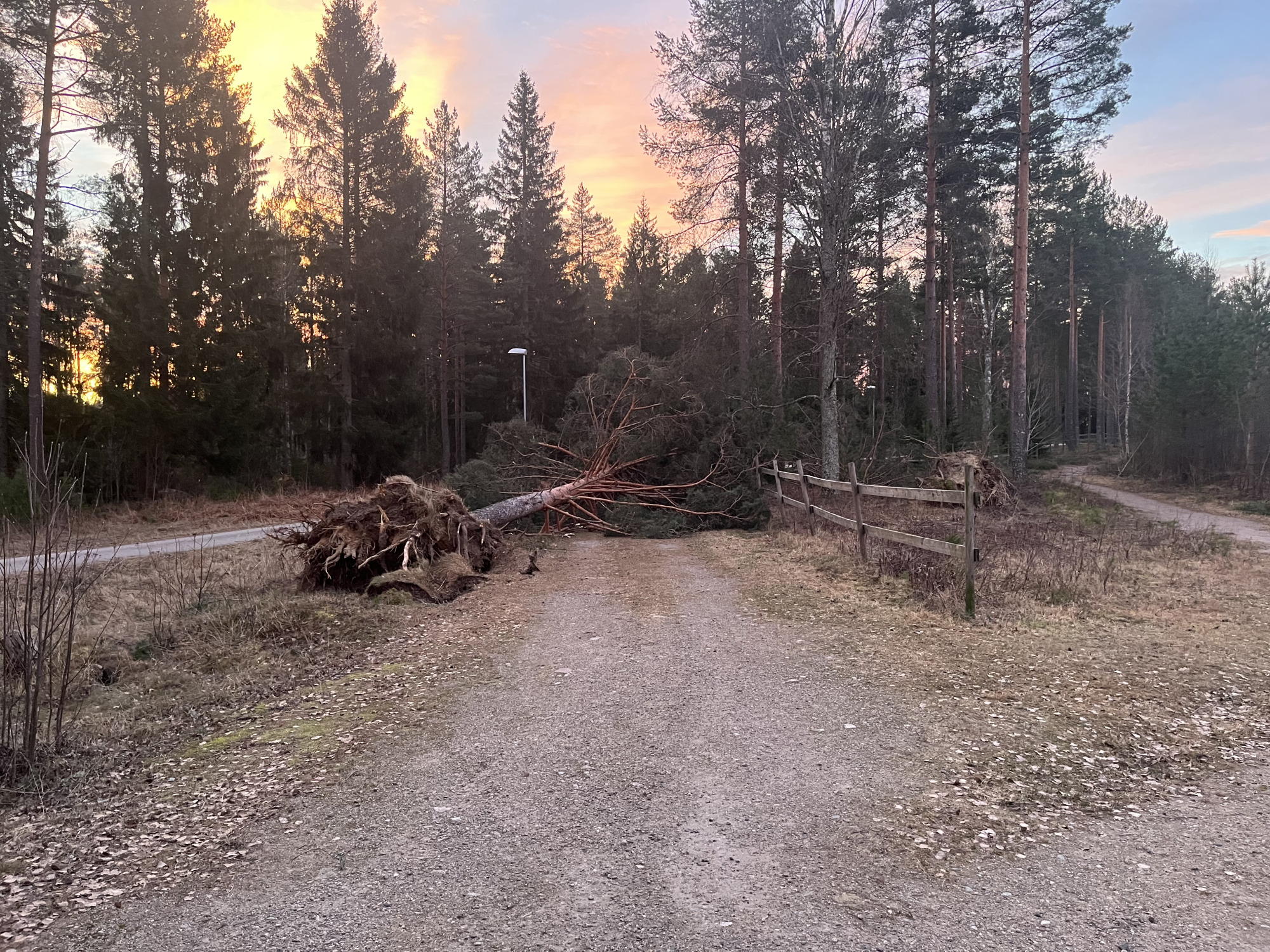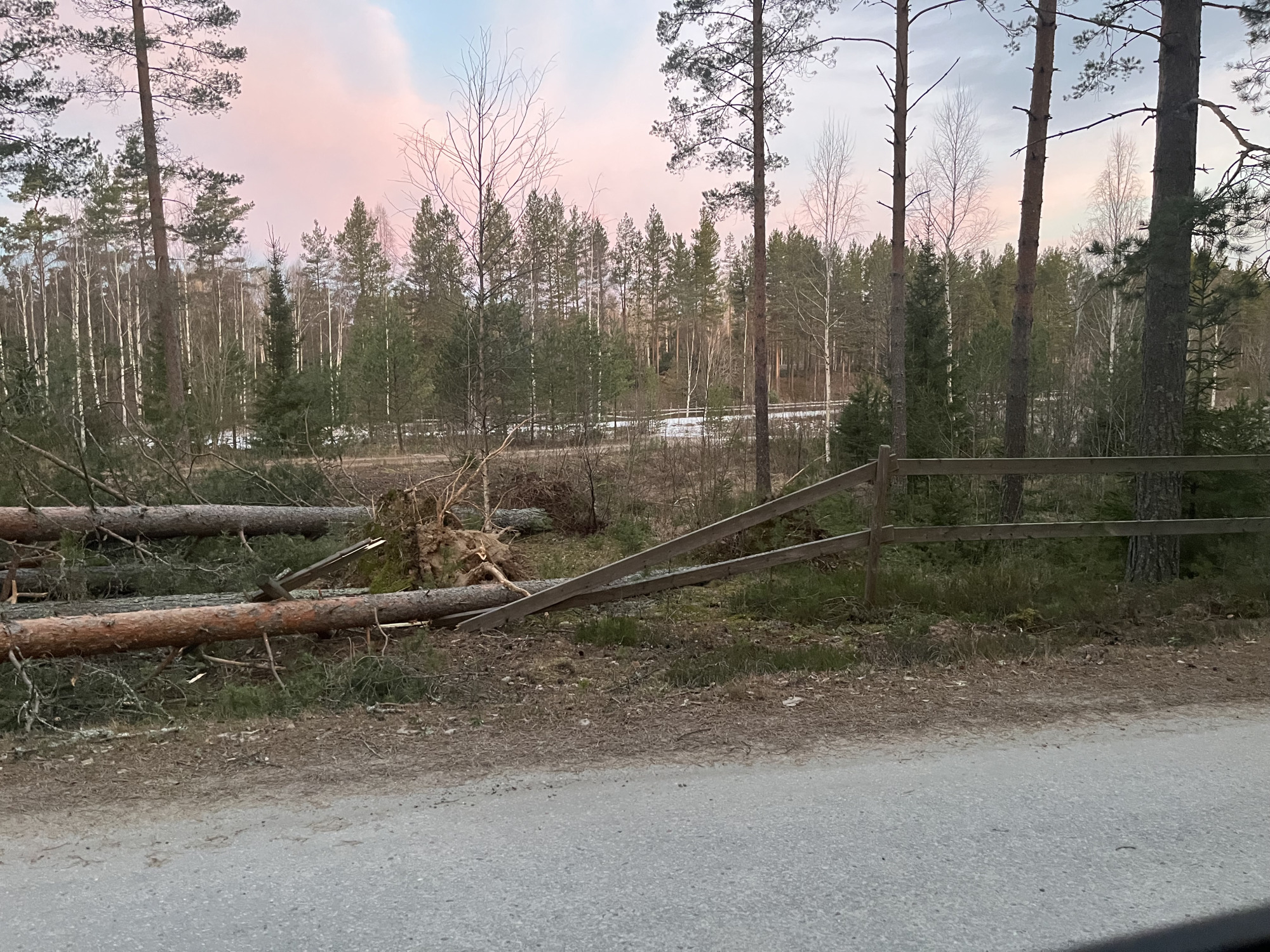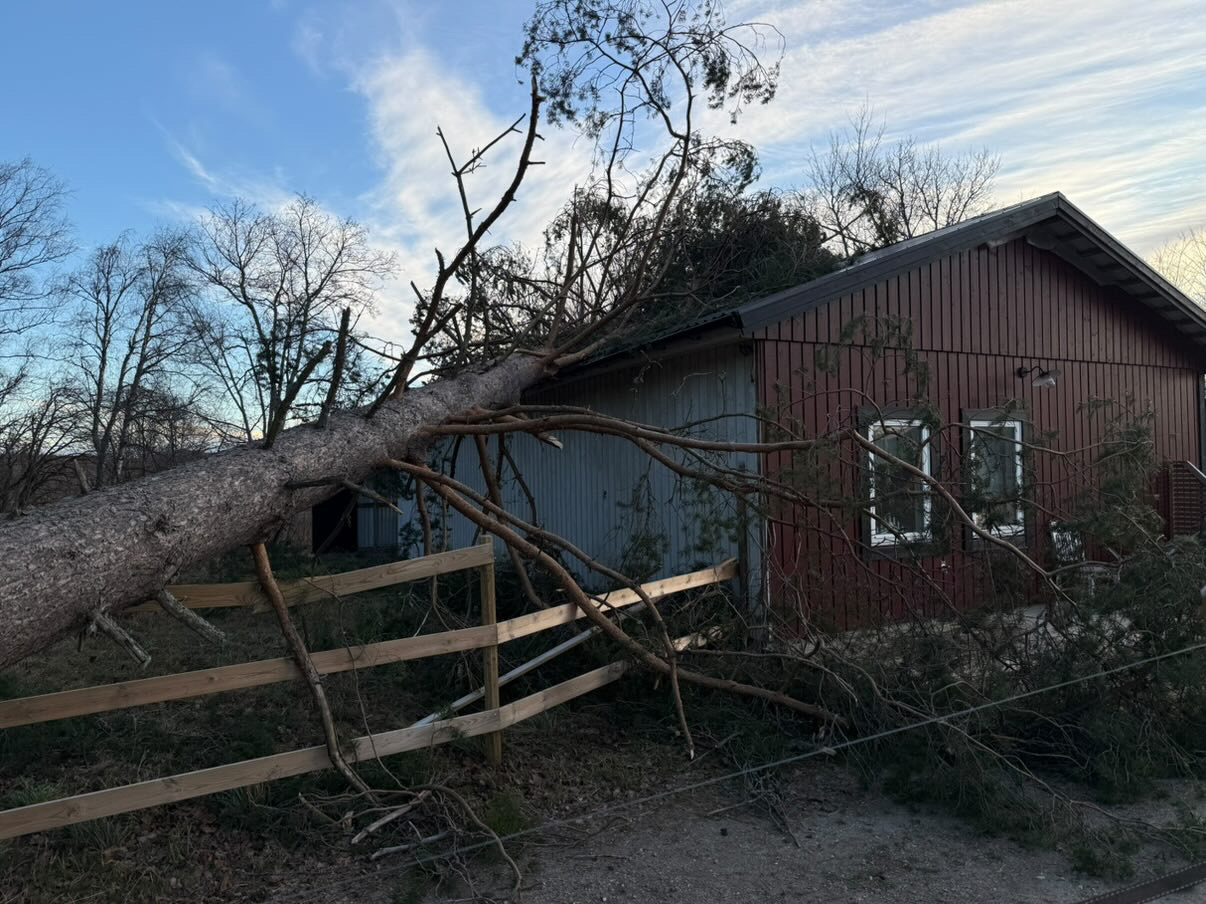 – Flera stora träd har fallit över stängsel, och stalltaket på ett av gäststallarna blåste av. Jag såg hur det flög ungefär 25 meter in i en hage. Jag blev livrädd att hingsten där skulle träffas, berättar linnea som släppte ut hingstarna under lördagsmorgonen och valde hagar med omsorg – utan mängder av träd.