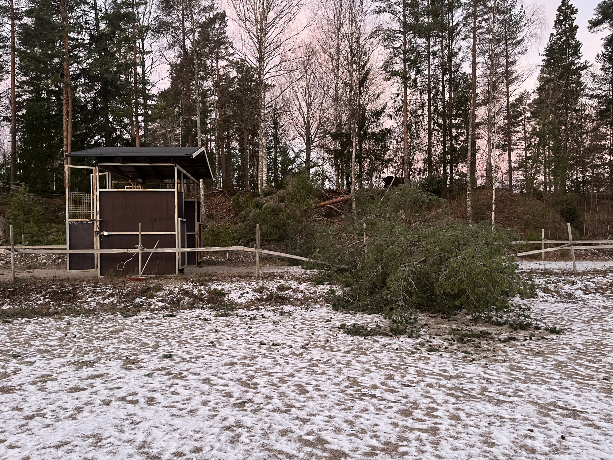 – Ett träd hade fallit över stallet. Jag är så glad att jag inte tog in dem. Det hade blivit en fruktansvärd stress för dem – och för mig, säger Emma som senare kunde konstatera att trädet orsakat en del plåtskador och ett hål i stalltaket.